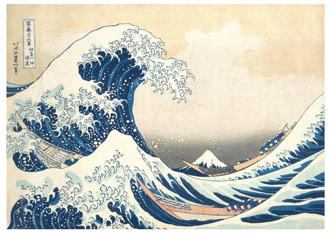 I was reminded of this little game I played last week while visiting an art gallery in NYC. When my girlfriend told me about the Takashi Murakami exhibit, I took a quick look at the website and thought I was in store for some beautiful art in the style of 18th and 19th-century woodblock prints and paintings. You’ve seen this gorgeous style, the most famous of which is probably “Wave off Kanazawa” (pictured above).
