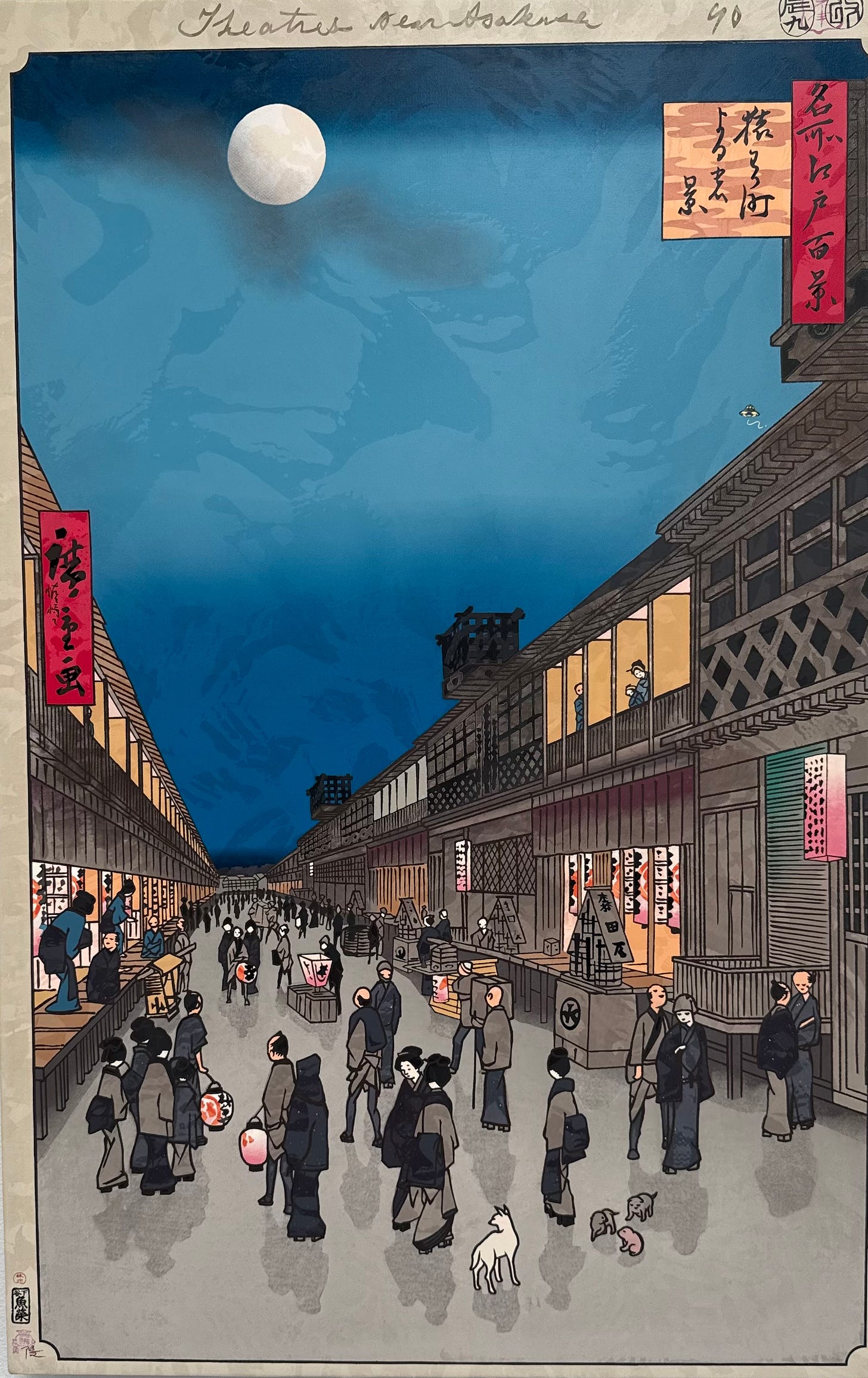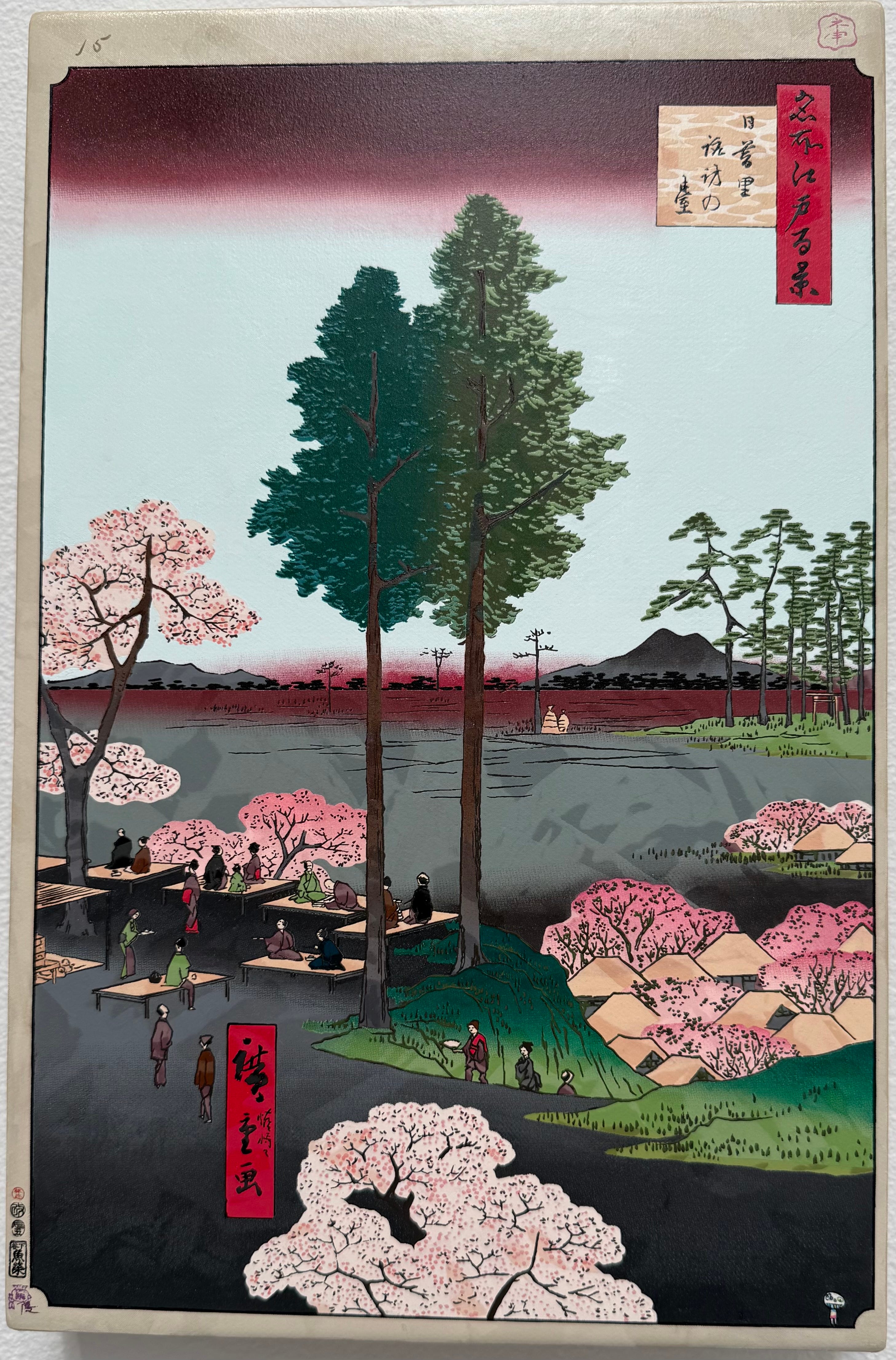 In each of the dozens of pieces showing at the gallery, you would see a traditional scene - nature, women in kimonos, people working in fields or shopping at a market, etc. Hidden in each of these beautiful paintings, there’s a little bit of play, something that catches the eye and doesn’t quite belong.